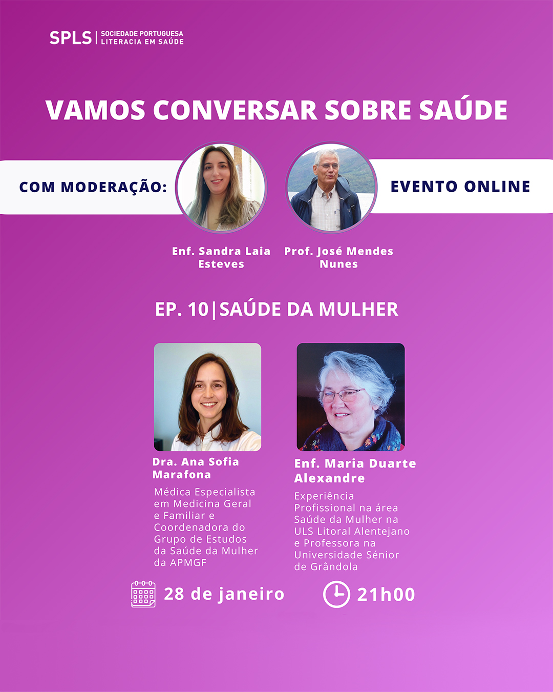 A Sociedade Portuguesa de Literacia em Saúde (SPLS) vai organizar no próximo dia 28 de janeiro, a partir das 21h00, nova sessão on-line do ciclo «Vamos Conversar sobre Saúde», desta vez dedicada ao tema «A Saúde da Mulher». A sessão será moderada pela enfermeira Sandra Laia Esteves e pelo médico de família José Mendes Nunes e contará com intervenções de Ana Sofia Marafona (médica de família e coordenadora do Grupo de Estudos da Saúde da Mulher da APMGF) e de Maria Duarte Alexandre (enfermeira com experiência profissional na área da Saúde da Mulher na ULS Litoral Alentejano e professora na Universidade Sénior de Grândola). Pode aceder à sessão Zoom aqui.